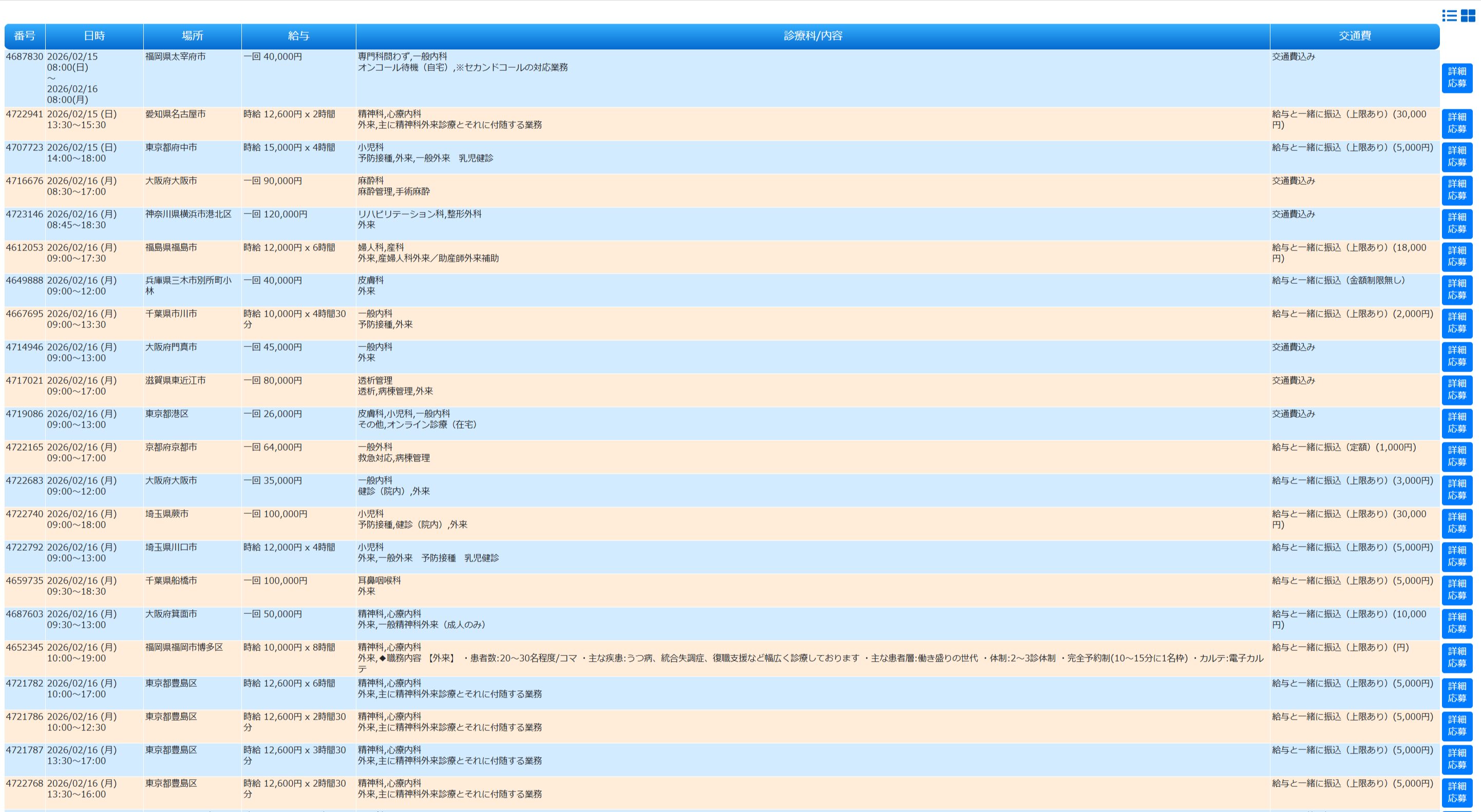 特に検診や寝当直、各専門科外来など昔ながらの案件に強い印象があります。